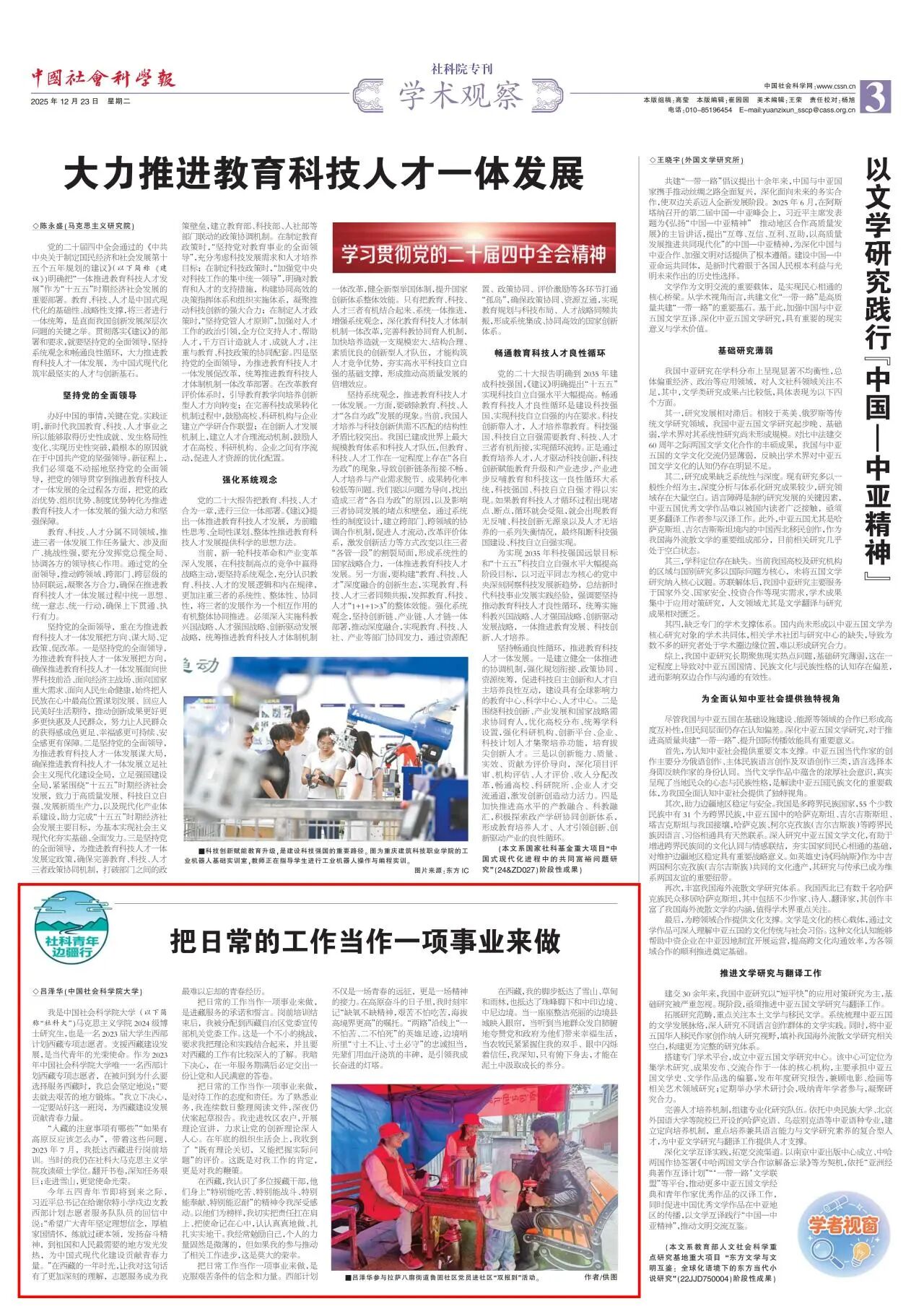 近年来,中国社科大主动将“西部计划”融入立德树人全局,先后有近百名同学投身西部,用自己的实际行动诠释新时代青年的责任与担当。近期,《中国社会科学报》的“社科青年边疆行”栏目刊登了我校西部计划志愿者代表的经验事迹和感悟体会。